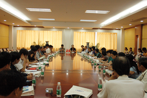 下午2点,越南河内教育厅中学与非学历教育代表团来到我校行政楼一楼会议室。周东兰对客人们的到来表示了热烈的欢迎。她向大家介绍了我校的学院概况,专业设置,各类在校学生的情况。她特别介绍了留学生的情况。她表示,近年来,我校招收的越南留学生人数有增多的趋势,本学期在读越南留学生40多人,而我校也致力于越南语加英语加辅修专业的双语培养模式。周主任还对大学城的建设、设施等情况进行了介绍,并希望越来越多的越南学生到大学城来学习。