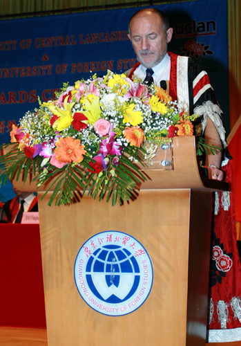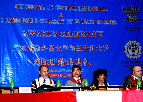 仲伟合在讲话中回顾了两校合作历史。他说:“早在1992年,广东外语外贸大学就与英国兰开夏大学建立了广泛的联系。从此,双方教师和行政人员各方面的交流日益频繁。2001年7月,两校合作开办的国际班2+1项目(即在广外读2年,兰开夏大学读1年)正式开始招生。合作课程也从最初的“国际商务英语”,逐步扩大到“国际商务”和“国际新闻”等专业。2005年底,在兰开夏大学等的大力支持下,我校成功申请到欧盟研究中心项目。兰开夏大学积极高效地为我们提供便利,使我校一大批老师和研究生有机会前往英国,与兰开夏大学的同行共同开展广泛的研究与交流。 ”