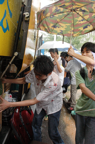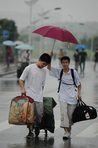 我们的摄影记者穿梭于人流之中,想要捕捉各种各样离别动情的镜头,期待着许许多多长亭送别的感伤,但最后却因为一场突如其来的雨而感到失望。在雨中,同学们赶着把行李往车上送,赶着为身边的人撑一把伞,赶着下雨的时间静静地看一下熟悉的校园,没有意料中的拥抱不舍,没有含情的泪水,没有过多的悲伤,至少表面上没有。