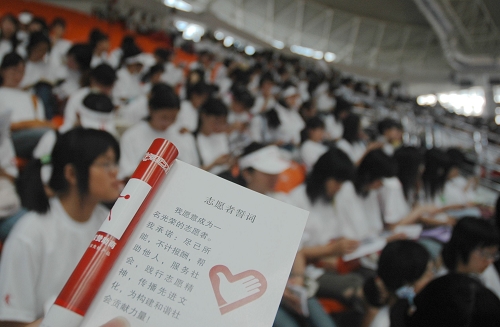 “我愿意成为一名光荣的志愿者……”这是《青年志愿者服务手册》的卷首语——《志愿者誓词》。它派发在每个参加第八届大运会广外志愿者动员暨培训大会志愿者的手中。