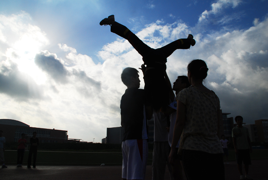 六点整,整个校园依然酣睡,将代表我校参加第八届大运会开幕式表演的健美操和跆拳道方块的队员们却已蓄势待发,在两位老师的带领下,开始了广外南校区操场上的训练。