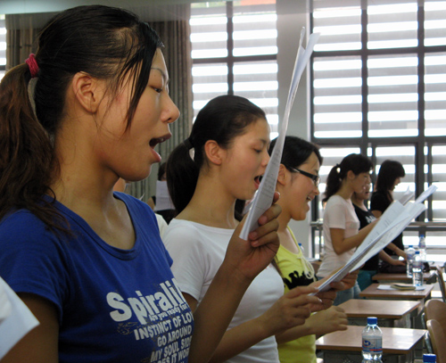 艺术楼514,房内不时传出艺术学院合唱团高亢的歌声。指导老师罗金燕正带着合唱团队员跟着伴奏合唱,同时不断和大家进行唱法上的交流研究,现场不时有同学们爽朗的笑声出现。