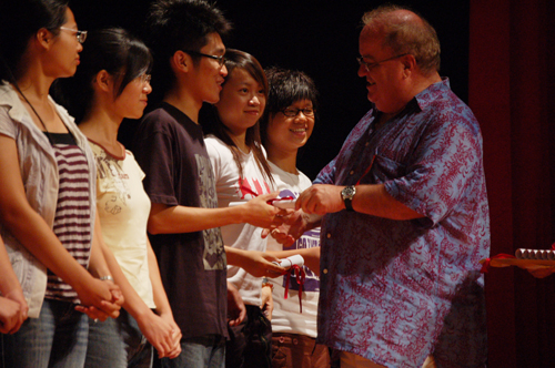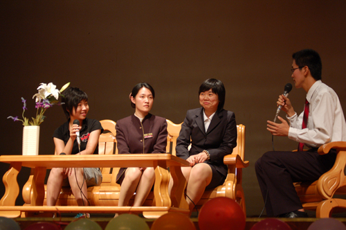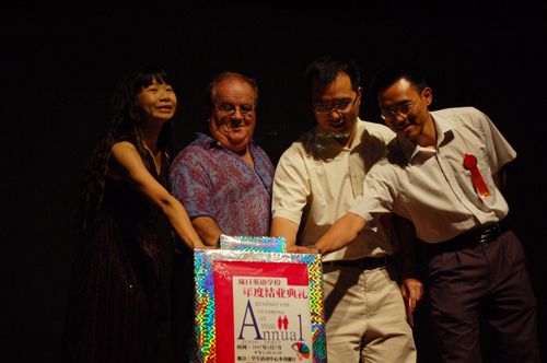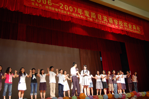本网讯 6月7日下午的学生活动中心多功能厅,椅子被别出心裁地摆成U字型。这里,2006—2007年度周日英语学校结业典礼隆重举行。校团委副书记何越晖、周日英语学校的创始人Dr. Nicholson和叶丹丹、指导老师余泽浩以及周英学校负责人赖晓丽共同按下亮灯仪,揭开了结业典礼的序幕。