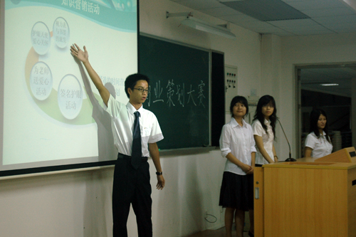 本网讯 6月8日晚,广外大第四届学术节学生团体学术月活动之商业策划大赛决赛在E205举行。此次活动由广外大第四届学术节组委会主办,校团联、国际贸易协会承办,经贸学院老师康峰莉,管理学院老师赖磊、周宁应邀担任本次活动的评委嘉宾。