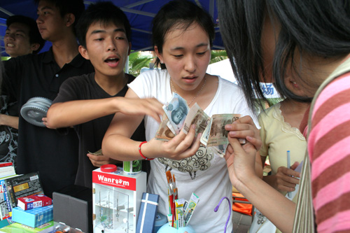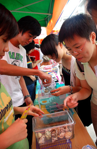 “想到什么就有什么”,这是商英学院易物点的口号,也是他们的服务理念,八成新的书和杂志,都是同学们捐出来的;“团结”则是政管学院的LOGO,他们的产品多、新、全,贴近生活,是大家一起努力收集的成果;而信息学院的IT精英们则崇尚回归自然,一杯杯清澈透明的水杯中养着斑斓的热带鱼,成了摊档上的主角,还有一团团可爱的小仓鼠,吸引了许多女生围观;英教学院虽然只有两个年级共三百多位同学,但是他们的物品一点也不比其他学院逊色,从足球到吉他,从“镇店之宝”(一个制作精美的小柜子)到一叠一叠英语教材,英教学院的负责人说:“We try our best!”