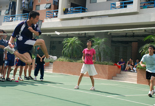 下午五点,随着主裁判一声哨响,决赛拉开序幕。双方主力均是大三学生,且同为姓 “谢”,双英争霸,两“谢”对阵,冠军将落入谁手?——商英和英文均派出其“铁三角”组合,两男一女的绝佳搭配,都是院中高手。英文学院的主攻手10号谢达明上午一度状态低迷,但一旦找回感觉,凭着必杀绝技——踩球和倒挂,还有副攻手密切的配合,英文学院顺利杀入总决赛。商英学院是防守型强队,主攻手谢哲以胸挡毽接落,以如铁桶般的防卫和敏捷快速的控毽技术,一路所向披靡。比赛一开始,英文学院主攻手便使出高空盘踢快速踩球先取两分。商英学院的主攻手毫不示弱,他如铁塔般伫立于网前,多次拦下突飞而来的毽球,并与队友给予有力的反攻。英文学院改变战略,三位选手默契合作,屡次用肩击球威胁对手。双方均以快取胜,红色的毽球在空中的划出道道弧线,引得观众阵阵叫好,双方以1:1各拿下一场。在最后的决胜场中,比分不分上下,比赛一度进入胶着状态。在14:14的又一次平手中,英文学院凭借强有力的进攻逐渐占领优势。最后,10号主攻手使出亮出拿手好戏,盘毽上踢、起跳抬脚,脚尖准确而有力地一点,红色毽球如羽箭一般小角度越过网界,对方主力防守不及,比分锁定16:14,英文学院摘下本次毽球比赛的桂冠。