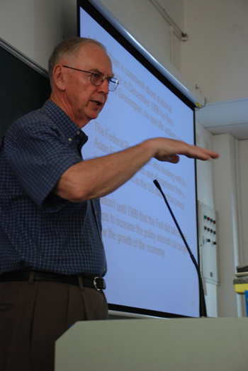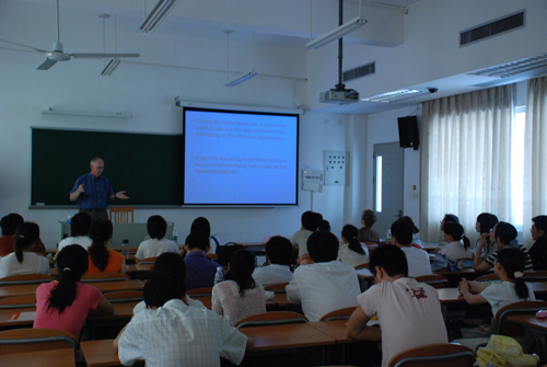 本网讯 6月1日下午2点30分,美国Sonoma州立大学教授、2006-2007年度美国富布赖特学者Larry Shotwell博士莅临我校,为我校经贸学院师生作了一场关于“美国货币政策的新变化”的讲座。Shotwell博士旁征博引、妙语连珠的演说令在场听众获益匪浅。
