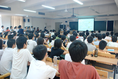 金海引用了八个新型的短语来阐明web2.0的应用及其对科学研究的影响。他在对“Shared book”,即共享书签的解释中举了CiteUlike这个网站的例子。如果我们写了一篇很好的paper,想和大家分享,就可以将文章上传到这个网站,他人便可以提出许多建议,由此科研的目的和意义也就达到了。另一个新型短语是“Video Sharing”,一般我们从网上下载视频观看要同时下载各种解码器和播放器,那能不能有一种统一的格式可以直接在网站观看到视频呢?金海告诉大家YouTube的开发者就做到了。他们将上载的视频转化为flash的格式,仅仅这样就大大方便了用户,就连google也无法匹敌。对于“Blog Tracking”,金海举了北大学生制作的Kooxoo系统这个例子。系统分为工作、住房、汽车、火车票等标签,其工作原理是从所有的博客中搜取信息,并在第一时间将信息反馈给消费者。譬如要购买火车票,你就可以在Kooxoo系统中搜索到他人转让火车票的信息。