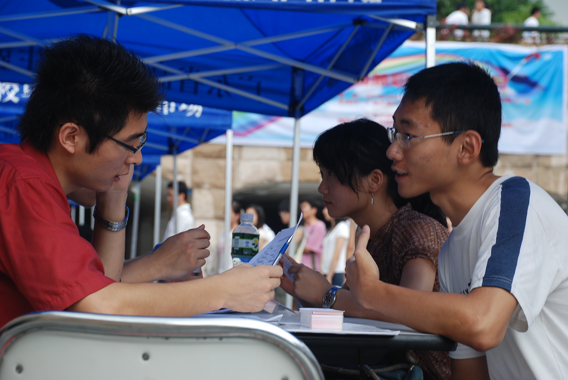本网讯 “彩虹行动,放飞梦想”。5月26日,由广外大勤工助学中心兼职服务办公室和管理学院团委学生会勤工俭学部联合举办的第二届大型暑期兼职招聘会在隧道口广场举行。韦博国际英语培训中心、广州嘉骏劳动力服务有限公司、欧中经贸网等12家企业参加了这次招聘会,涉及旅游、电子、报刊、金融、保险、外语培训等多个行业。招聘会为同学们提供了两百多个职位。