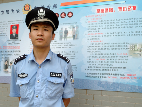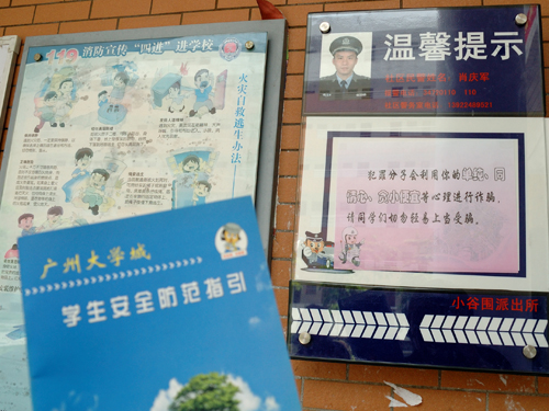 负责我校警务室的社区民警肖庆军则希望广外的同学们能够加强自我防范意识,多与警务室联系,师生有困难可以求助警务室民警,有案情可以通过校保卫处,也可以直接向警务室报案。