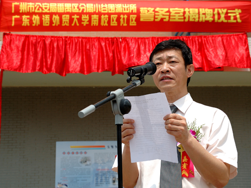 随后,我校党委副书记许国彬发表了讲话。他首先代表广外对到场的各位来宾表示了热烈的欢迎。许国彬简要回顾了南校区建校以来的安全保卫工作。他感谢公安部门特别是小谷围派出所对我校工作的大力支持,以及对我校建设“和谐校园”和实现学校的跨越发展工作中作出的贡献。
