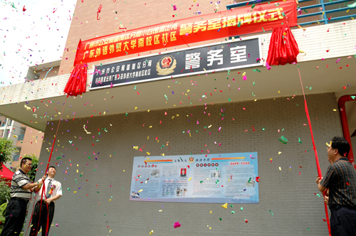 本网讯 5月29日上午,广东外语外贸大学南校区社区警务室揭牌仪式在学生宿舍7栋楼下举行。校党委副书记许国彬,来自省公安厅、番禺公安分局、小谷围派出所、小谷围街道办事处的领导,以及广东省各大高校的代表出席了本次仪式。