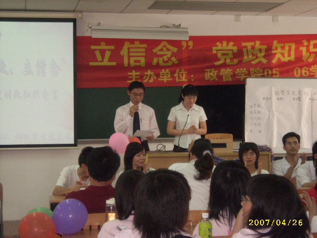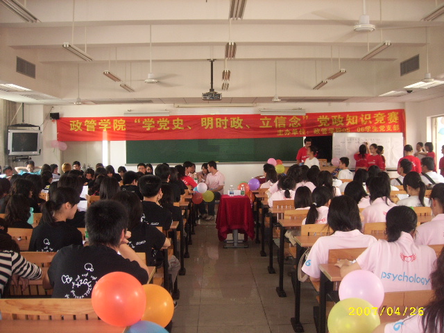 本网讯 4月26日下午,政管学院筹划已久的05、06学生党支部“学党史、明时政、立信念”党政知识竞赛在F508成功举行。学院党总支副书记麦培年、团委书记梁玲华作为评委和颁奖嘉宾出席了这场比赛。经过一个多小时的激烈竞争,06应心班脱颖而出,夺得冠军,而最佳组织奖则由06行一获得。本次比赛有05\\06学生党支部负责组织.以各班级的党员、入党积极分子为骨干班级团支部组队参赛.竞赛得到05、06级学生团支部的大力支持,各个班级的积极响应,所有人都全身心投入到这次活动中。