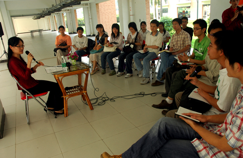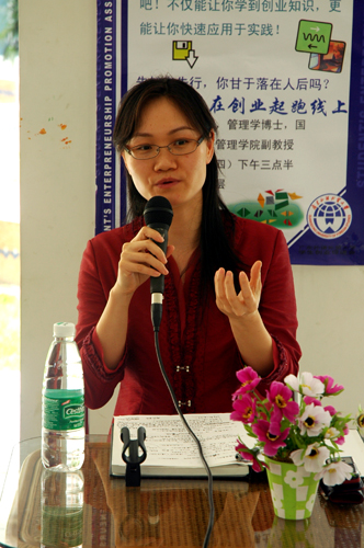 在创业管理这方面,她还结合了勤工助学中心、云山创业园的两个例子进行讲解,她肯定了目前这两个实体的经营模式,但在一些方面仍然需要改进,学校给同学提供一个平台,但为什么实体某些摊点的盈利仍然比不上贝岗村的某些商人?她说,大家应该借助学校这个广阔的平台,培养创业责任感,要有吃苦的精神和创业精神,追求理性的冒险。她强调,“大家要发自内心的去为大家提供实质性的服务。”