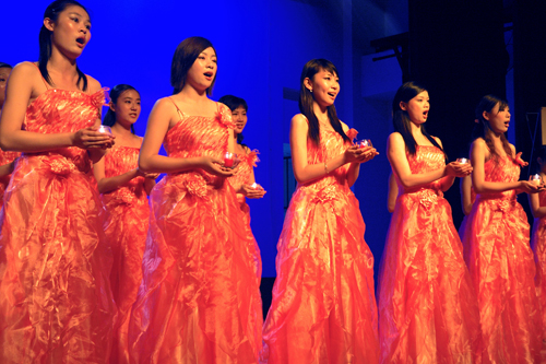 紧接着,艺术学院06级女子小组身着粉红色长裙,手捧盛有燃烧红烛的玻璃杯,在张婷婷老师的钢琴伴奏下,演唱了一首《感恩的心》,动听的歌声陶醉了在场的观众。