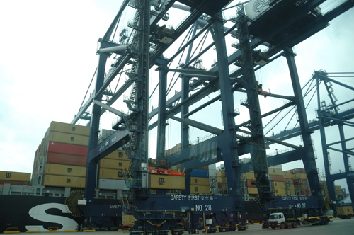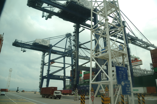 随着旅游巴士慢慢接近码头中心,展现在实践队眼前的是不计其数的用大型集装箱堆置而成的“高山”,这些堆场上高置的集装箱足以挡住人眺望对岸香港群山的视线。通往码头各处的通道都被堆场上的集装箱堆严密地包围。在码头起建之前,堆场附近都是海水,现今的堆场是人工填出来的用地。当巴士开近岸边,价值上亿人民币的巨型岸吊和龙门吊随即跃入实践队的眼帘。技术操作员每天都以出色的运吊技术在40多米的高空把集装箱在货车与货轮之间来回运吊,精准的眼界不得不让人佩服。远望岸边,比明思克航母还要长数十米的万吨巨轮正稳稳停靠在码头泊位上;在更远处,就是中国衣鞋、家具、玩具远销欧美的所经航道。