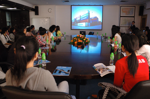 当巴士在码头堆场巡游一番过后,实践队从集装箱上看到的船公司名字再多的就莫过于MAERSK,EVER GREEN,PIL这些品牌了。作为一座码头,它不会有太多直接客户,大多数客户都是船公司。怀着对码头的种种好奇,实践队进入了盐田国际行政楼,一听企业联络部方主任对码头的介绍。