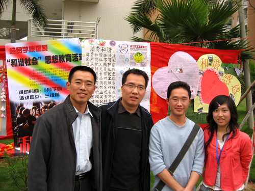本网讯 为响应党的十六届三中全会“构建和谐社会”的号召,进一步加强团建工作,经贸学院团委在校团委的指导下,以“剪辑生活点滴,记录和谐人生”为主题举办了“和谐社会”思想教育活动,并于3月22日下午在南校区云山创业园旁的校道上进行了活动海报总结展出。校团委副书记何越晖老师、经贸学院团委书记余泽浩老师也莅临现场指导、题词并合影留念。
