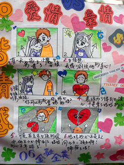 四点,刚制作好的海报一展出便吸引了大量的同学前来观看投票,并签字留下了自己对和谐的感言。海报凝聚了同学思想的精华,主题多样,色彩或浓重或素雅,形式各有千秋:以“和谐消费”为主题的海报将中国传统书法完美的融入其中;金融全英班则别出心裁地以漫画的形式描述了一个和谐感情的故事;中国地图也被搬上海报,经济班的同学们以“和谐中国年”吸引众人的眼球,全球的和谐共处也成了海报的主题……各班的海报都别具特色,投票现场盛况空前。许多同学都笑着说:选票只有一张,而好的海报却有这么多!