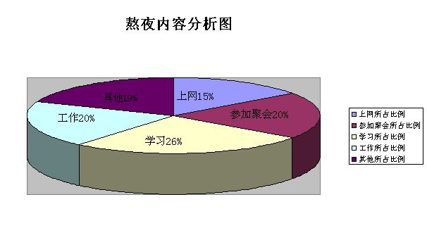 为了了解我校学生熬夜的情况,记者作了相关的调查。在接受采访的同学中,大部分同学均表示有过熬夜经历。而熬夜的时段主要集中在宿舍统一熄灯后至凌晨两点。有熬夜经历的同学都表示熬夜后会感到疲劳,精神不振。一部分同学会利用第二天的课堂时间补充睡眠,其余人会选择在放假前熬夜,然后利用假期时间补充睡眠。那么熬夜时他们到底在做些什么呢?在随机派发的50份调查问卷中,记者得到了如下数据。