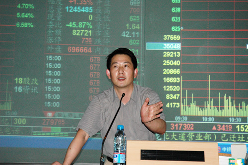 本网讯 3月28日晚上7时,由中国证券业协会执业分析师刘继森主讲的证券投资讲座在我校教学区举行。本次讲座由我校经济学协会和国际贸易协会主办。在讲座上,刘博士就股票投资的前期准备、投资实操、交易规则等方面进行了讲解。