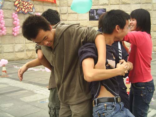在“四人五足”摊位前,同宿舍的四个同学两两的脚被绳子绑在一起,哨声一响,便竭尽全力向前冲去。默契地一起喊“一二一”,努力向终点冲去。四人五足,玩的就是齐心协力。
