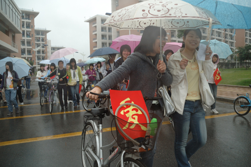 上午九时,天公不做美,空中飘散起淅淅沥沥的小雨,寒风不时拂过怀揣爱心出发的商英国贸专业八十余位同学的脸庞,但他们火一般的气势没有被冻雨浇熄,反倒更加斗志昂扬起来。沿着内环,他们开始“环城单车,爱心召集”活动。当同学们或骑车或步行到达目的地时,虽然身上的衣服都被雨水打湿了,风更灌入了丝丝寒冷,但大家热情不减,未来得及休息,就又全身心地投入工作,商讨雨天开展活动的应急方案,并抓住一切机会向路过的同学做宣传。
