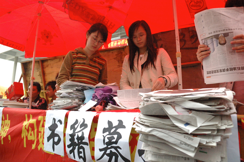 在华工新闻学院及其志协的协助下,爱心捐书也如火如荼地同步展开了。募捐刚开始时发生了一段小插曲:由于事前联系不足,舍管以探访者不可募捐之条例阻止同学上门展开活动。但是同学们没有气馁,他们及时调整了方案,在人流较多的饭堂前驻点收集大家捐献出的书刊杂志。同学们忘我地忙碌着,不畏早春的寒风,不惧劳顿饥饿,耐心地宣传,真诚地帮助献爱心的同学做“爱心搬运”。投入的工作换回的是华工师生的大力支持和尊重,看着逐渐升高的书垛,所有人忘记了疲惫,欣喜之情萦绕心头。