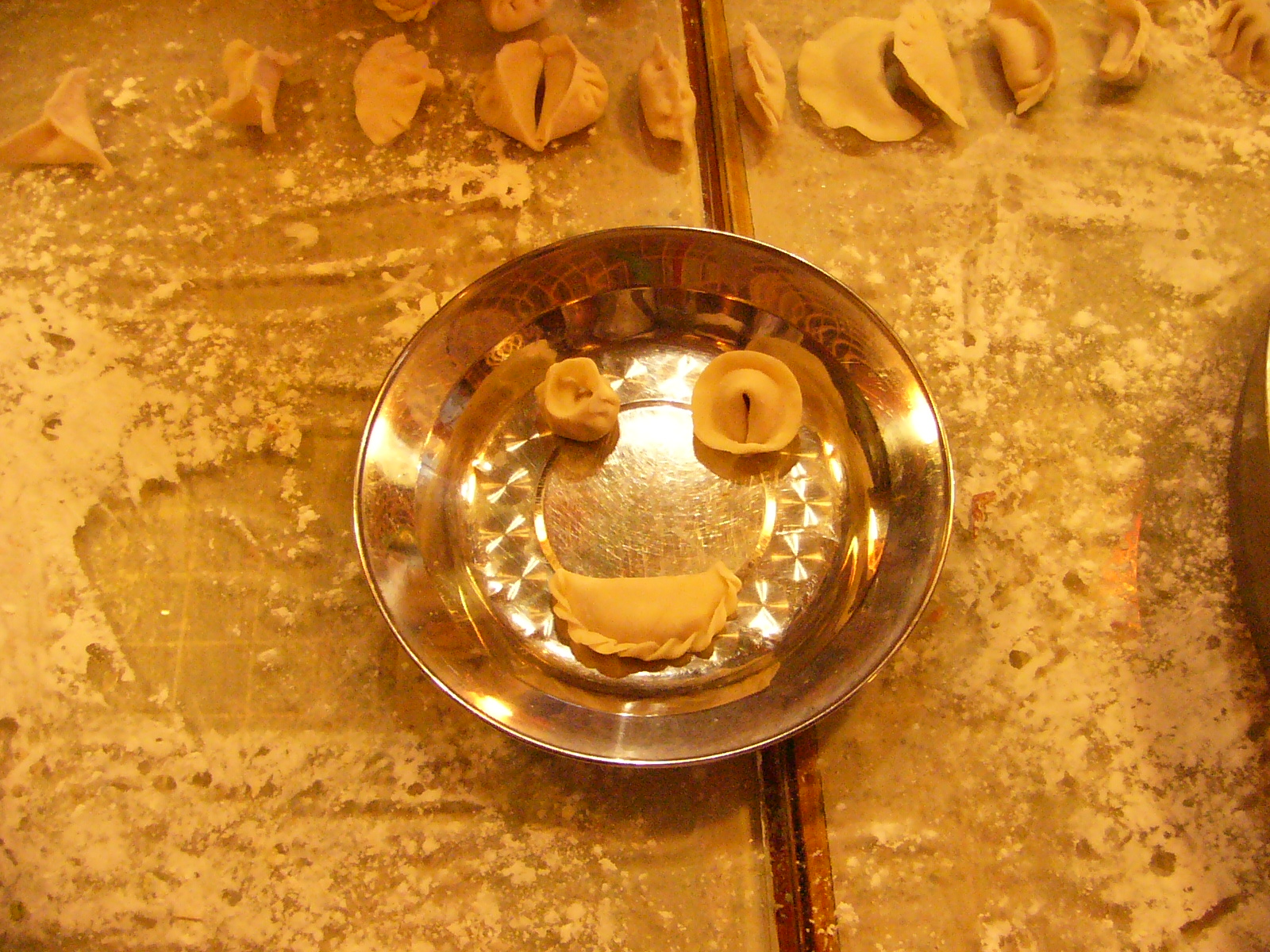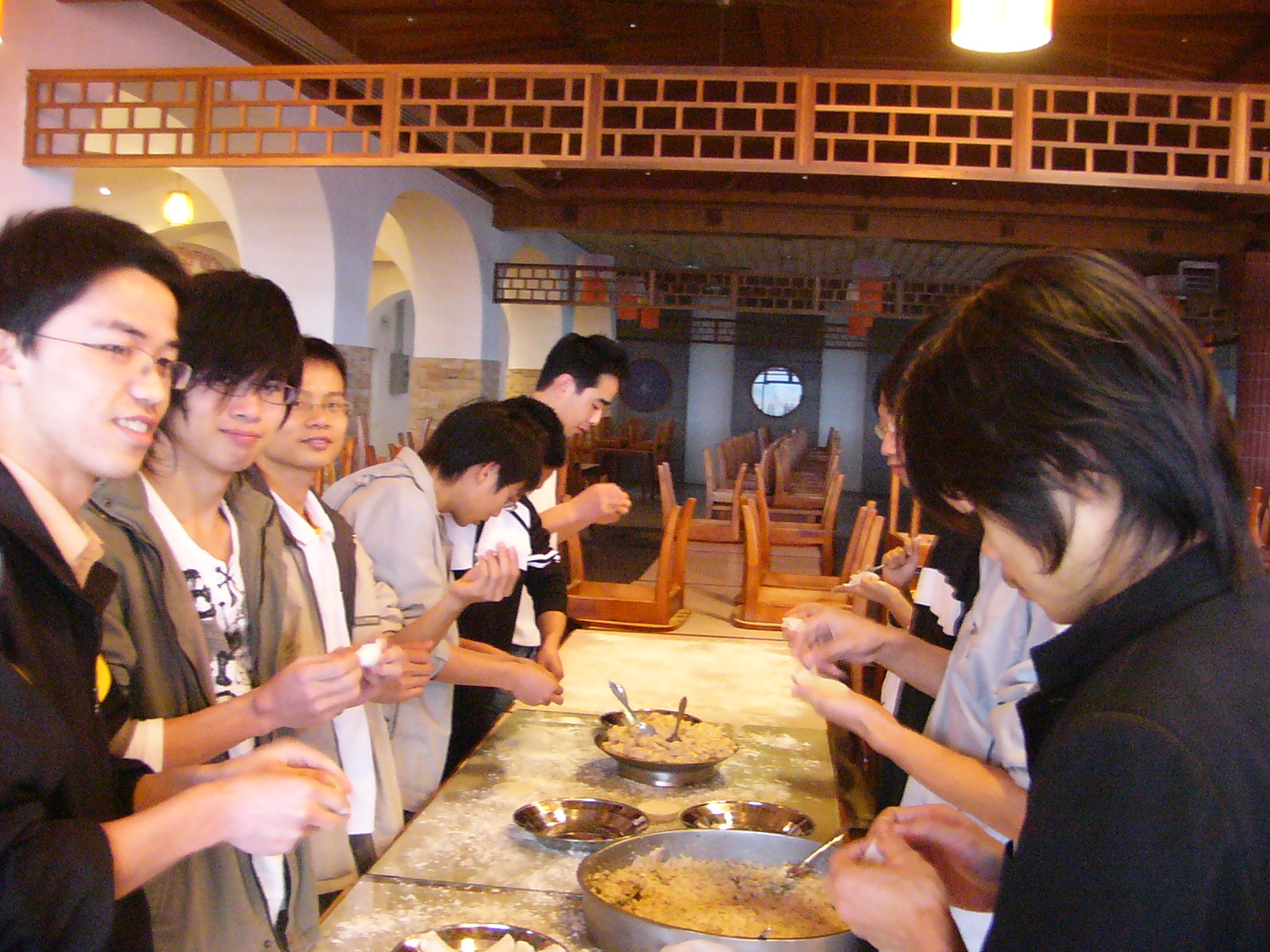 大家包的饺子样子形形色色,多种多样,有一些形状还十分有趣。盘子里已经不是饺子了,成了云吞、烧卖、牛角等的拼盘,大伙儿热热闹闹,兴致勃勃,挺有心思的。包饺子时大家便聊起自己小时候包饺子的经历或者是自己家乡过年的见闻,整个饭堂俨然成了一个温暖的家庭厨房。