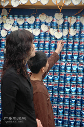 天河宏城广场,一个孩子在妈妈的陪同下看着许愿留言