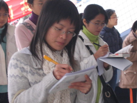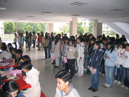 据了解,勤工助学中心本次招聘旨在使各职能部门及实体正常运行,为全体师生提供更优质、全面的服务。下午1点多,招聘会还没有开始,但招聘处已经排起长龙。这次总共提供了62个职位,但在短短的三个小时里,前来应聘的学生已经突破了500人。云山精品阁、云山书报亭、云山周末舞会、云山跳蚤市场、云山健身室等实体备受欢迎,财务部等职能部门要求虽高,但人气却很火爆。直到下午4点30分,云山健身房、云山周末舞会、云山书报亭等实体仍旧“门庭若市”。