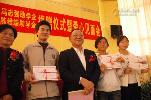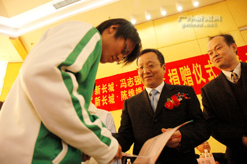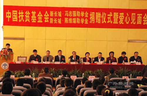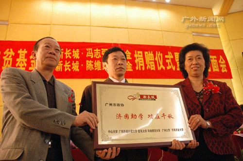 2006年9月,澳门文根建筑置业公司董事会主席冯志强先生通过中国扶贫基金会新长城项目向广外、中大、华农和广大的100名特困生捐赠86.4万元以资助他们大学四年的生活费;同期,香港陈叶冯会计师事务所有限公司首席董事陈维端先生向广外、华农、华师和暨大的100名特困生捐赠86.4万元以资助他们大学四年的生活费。