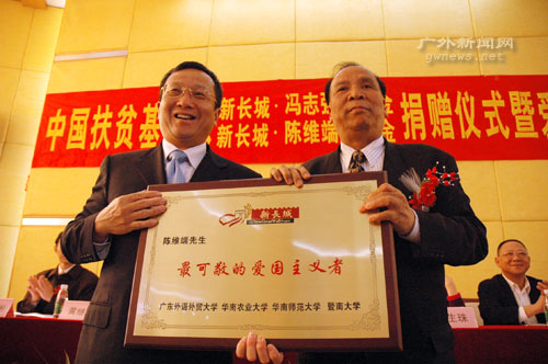 在当日的捐赠仪式上,扶贫基金会副会长陈开枝代表受捐助的高校接受冯志强先生和陈维端先生共172.8万元的捐赠款,并向两位慷慨解囊的港澳富商赠送“最可敬的爱国主义者”荣誉牌匾。