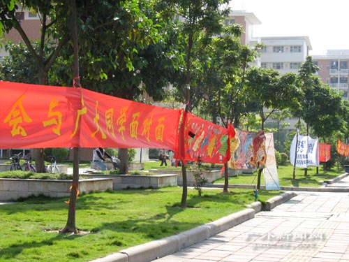 “炭精画艺术全国高校巡回讲座”,“五五普法,心我传承 ”,“心灵相通,心声相应”……近段时间,校道上的横幅各式各样,细心数数,有近三十条。从文采园对出的路口一路到又康超市门口对出的校道两侧都被挂满了,有的甚至被挂在了宿舍楼上。