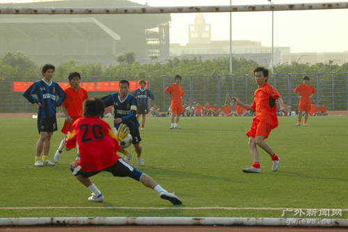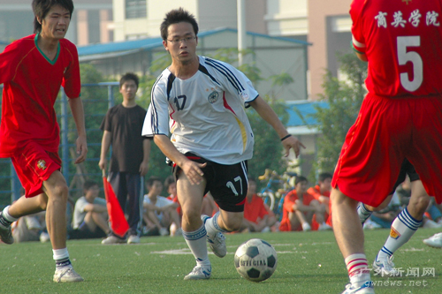 商英学院队与新闻学院队的比赛是E组的强强对话。开场不久,双方都踢得比较谨慎,互有几次试探性的进攻。双方的几次攻防都体现出各自的章法,商英学院队主要是以边路突破,中路包抄为主。而新闻学院队则凭借前场几名善于盘带的球员为球队拉开空档创造射门机会。