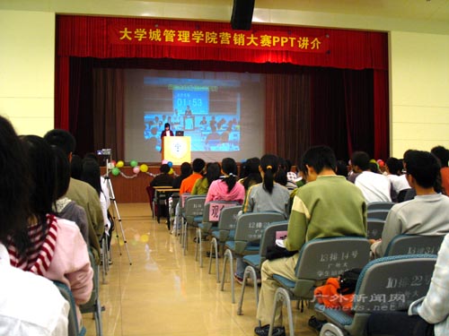 本网讯 12月6日晚7点,由大学城各管院联合举办的大学城管理学院营销大战之PPT展示活动在学生活动中心成功举行。来自大学城各管院的8支代表头角峥嵘,真是八仙过海,各显其能。