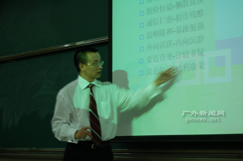 本网讯 12月5日晚上七点,由广州电台主办的大学城十大高校大型公益巡回讲座在广外C208拉开帷幕。中山大学心理学系主任、脑功能影像研究中心副主任高定国教授,广东电台主持人Alex,广州电台主持人Kevin,中山大学、广州大学等高校的学生会代表以及广外各学院学生会代表出席了此次讲座。