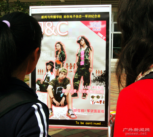 现场通过电脑和图片展展示了杂志内容,内容主要围绕06新生的军训全记录,军训特刊中有军训拉练篇,阅兵篇,教官篇,离别篇,同学的心路历程篇,军训狂想曲,军服大改装,军训装备大公开和学院06红人馆等。