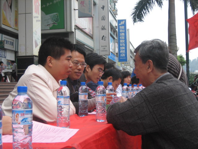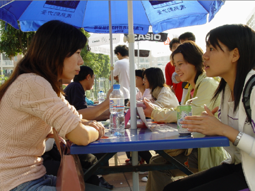人行道上人来人往,不时有同学驻足倾听老师的意见,或坐下与老师细谈心中的感受。老师则给每一位同学报以微笑,不厌其烦地解答疑惑,并且由此及彼,比如从专业上延伸降到将来就业去向,分析目前的就业形势。在这里,就业上大家意见相互分享,而心理上的疑惑老师则给予了高度的保密,活动顺利进行。