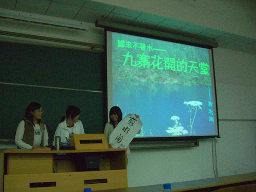 每支参赛队伍都由三个人组成,他们使出浑身解数,以制作精美的PPT和FLASH,向评委和观众们展示了他们自己旅游过的或者自己向往的地方。并且,每支队伍的队名都独具匠心,像“剪水间,“凤凰四重奏”,“米兰三剑客”,“锵锵三人游”等等。他们大多是介绍国内的景点,像九寨沟、凤凰城、周庄等;也有介绍国外景点的,如巴黎、米兰。比赛过程中观众不时因选手们展示的PPT中优美的景色发出惊叹声。