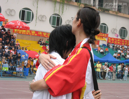 警戒线听似神圣不可侵犯的名字,然而在群众的力量下,这条线显得相当软弱。不少学院的啦啦队,为了给选手们以零距离的鼓励,在守卫员稍不留意的情况下抓紧机会冲破这道防线,“刷”的一声全涌向跑道,如同缺堤的洪水。