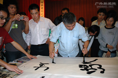 本网讯 11月16日下午2点,“书情画意”广东外语外贸大学2006年书画大赛总决赛暨颁奖典礼在南校学生活动中心隆重举行。著名书画家高瞳受邀出席了颁奖典礼,我校老师程道树、陈显伦和广东十所高校书画协会代表也来到活动现场。