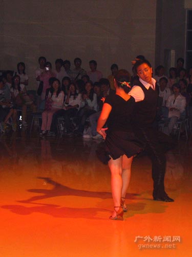 精彩的表演过后是自由舞蹈时间。开始时,观众们都不敢走到会场中央献舞。在主持人的鼓励和“绿精灵”舞协队长带动下,越来越多的观众随着强劲的音乐在会场舞动起来。有的“舞”林高手翩翩起舞,成为会场上的焦点,也有初学者小心翼翼地学着舞步,有的过于紧张以致踩到舞伴的脚,引起一阵笑声。“Left, left,right,right,go turn around,go go go”,兔子舞的旋律更是将现场的气氛推到极点,无论“舞”林高手,还是初学者,全场几乎所有的观众都纷纷参与其中,围成了一个“火车”。随后,在一位男舞者的引出下,表演群舞恰恰的五名女舞者徐徐出场。身着黑色舞衣,脚踏金色舞鞋,她们随着轻快的音乐起舞。Band队也不甘落后。两曲《小城故事》,《夜来香》的经典歌曲,经过电吉他、萨克斯、架子鼓的重新演绎,别有一番风味。