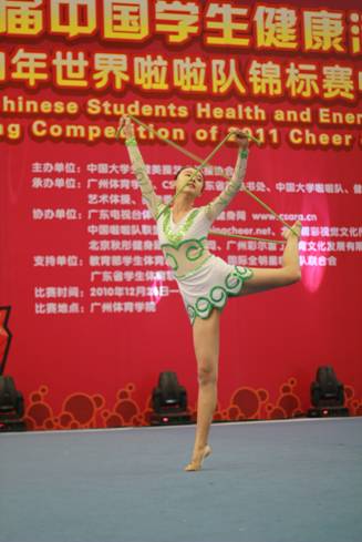 2010第五届中国学生健康活力大赛暨中国大(中)学生健美操、啦啦队、艺术体操、健身健美锦标赛于12月27日在广州体育学院隆重开幕。在体育部党总支书记李旭武的亲自督战下,我校代表队在艺术体操、健美操、啦啦队等多个比赛项目中表现出色,取得5金、6银、2铜的骄人成绩。广外代表队曾在去年12月参加上一届大赛成绩斐然。今年吸纳了不少2010级的队员,在教练师小蕴、刘珺的指导下,新旧队员迅速磨合。由于11月的亚运会和12月的亚残运会影响,我校队员们仅用了不到1个月的时间集中备战本次比赛,有时甚至牺牲午休和晚修的时间。