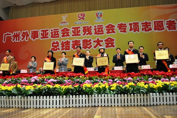 本网讯 12月30日下午,广州外事亚运会、亚残运会专项志愿者总结表彰大会在广州白云国际会议中心隆重召开。大会由广州亚运会、亚残运会外宾和港澳台侨贵宾接待指挥中心、广州市人民政府外事办公室、共青团广州市委员会联合主办。1200名外事志愿者欢聚一堂,共庆广州亚运会、亚残运会外宾和港澳台侨贵宾接待任务取得圆满成功。