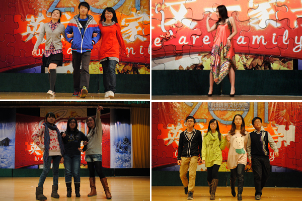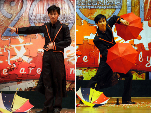 平时总在幕后付出的英文团学成员们本次也走上台前,为观众们带来了精彩演出。主席团和各部门的部长参与了晚会开场视频《迎新晚会那些事儿》的拍摄,同时带来雷人走秀和《难兄难弟》囧舞。其中,实践部部长曾莞闲和学习部部长钱锐的性感走秀更是惊艳全场。有同学惊呼,“原来部长们这么搞怪!”