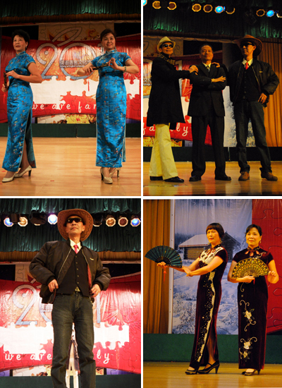 身穿华丽的旗袍,手拿精巧的扇子,老教工风采队的女教工们踏着高跟鞋袅袅上场。一举一动,风姿绰约,诚如主持人所介绍,“满地余寒露凝香,凝不住前辈们绝美的年华”。当古典的音乐悄然而止,欢快的节奏响起。风度翩翩的“牛仔们”伴着节奏自信地走着台步,举手投足间流露出独特魅力,再次引起全场欢呼。