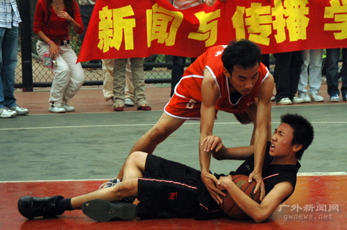 同时进行的另一场比赛是新闻学院对阵经贸学院。新闻学院继续稳定发挥,以38:30的比分战胜对手,挺进4强。这已是双方在本届比赛的第二次碰头。此前小组赛中新闻学院曾以35:26战胜过对手。