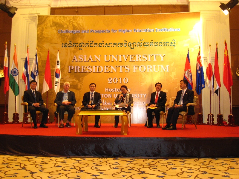 本届论坛的主题为“高等教育的挑战与机遇”,共有来自十一个国家的十五所大学参会。刘建达在大会讨论环节做题为“广东外语外贸大学建设高水平教学研究型大学的探索与实践”主旨发言。在本届论坛上,我校与柬埔寨诺顿大学、柬埔寨湄公河大学及泰国基督教大学签署了合作备忘录,拟在学生短期交换、中文教学、教师互访等方面展开合作。大会决定,第十届亚洲大学校长论坛将于2011年10月31日至11月1日由日本亚细亚大学在东京举办。
