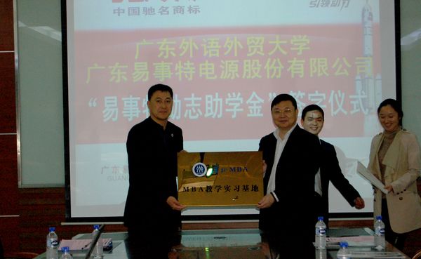 本网讯 12月22日,我校MBA实践教学基地挂牌和“易事特励志助学金”签约仪式在广东易事特电源股份有限公司举行,校党委书记隋广军、易事特公司董事长何思模教授出席仪式。校办副主任谢伟光、MBA教育中心执行主任孙建军,易事特公司国际贸易部总监张晔、总经理助理卢水洪和人力资源部部长聂仁君参加了仪式。